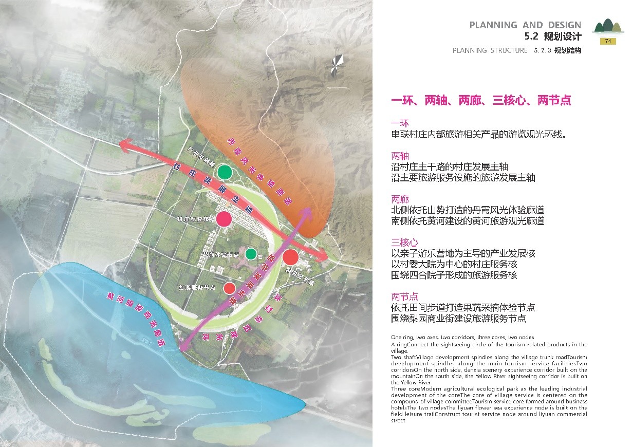 红柳滩村位于黄河旅游发展带上,紧邻黄河,打造串联村庄内部旅游相关产品的游览观光环线。规划借力黄河优势,占领文化高地,以亲子游乐营地为主导的产业发展核心,以村委大院为中心的村庄服务核心,围绕四合院形成的旅游服务核心,激活"乡、土"塑造产品品牌,整合村或优势资源,构建梨乡生活体验区。