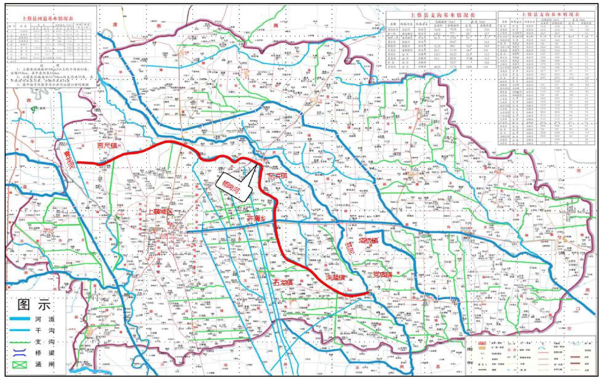 工程内容:上蔡县境内十四条河 "一河一策"方案,范围在上蔡县境内十四条河干沟及沿支沟上溯 500m 两侧各200m,总长度为211.7公里。其中包含蓍台沟、蔡河、界沟河、老北汝河、南杜二沟、杨岗河、杜一沟、解放沟、和沟、杨河、茅河、青龙沟、南柳堰河、北柳堰河。