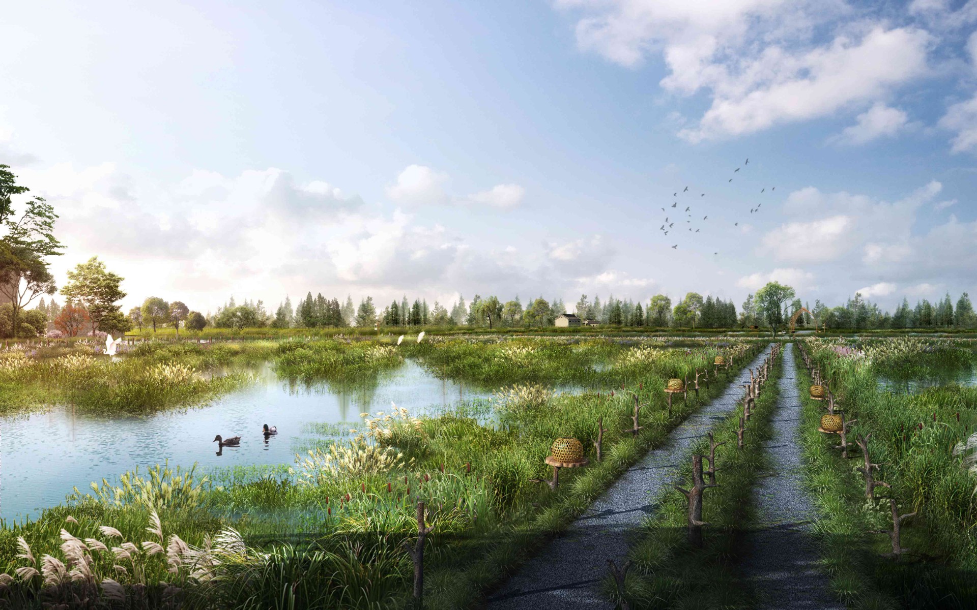 项目分为合理利用区、自然保护区以及生态保育区,坚持以自然助力自然,以打造陕西东大门生态建设的亮丽名片为出发点,以保护修复为基本原则,进行湿地公园植物补植补种、新建绿化防护林、建设巡护道路、增加导视导览系统、布设监控系统等,打造"生态保护、科普教育、休闲游览"三位一体的国家级黄河生态湿地典范。