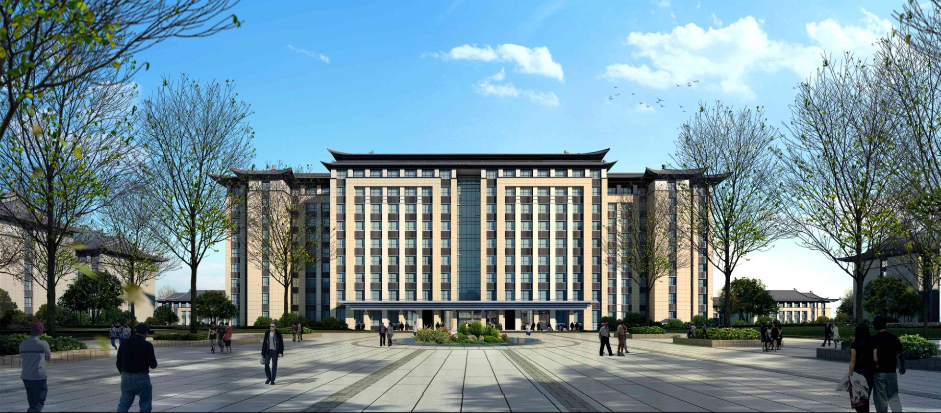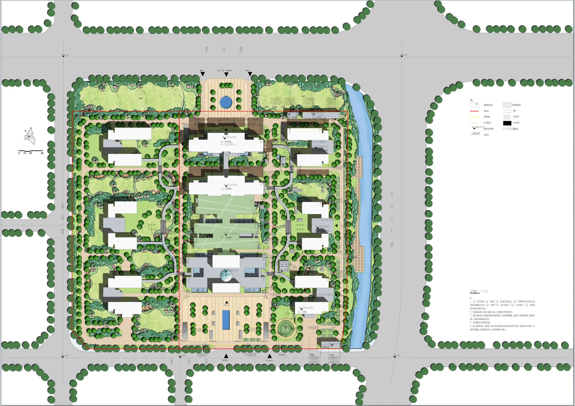 综合医院延续中原传统文化及河南省医的历史风格,采用中轴对称的传统院落式规划:总体布局南低北高,建筑坐北朝南、错落有致,实现日照、视线最大化的健康生态理念。严谨有序的建筑布局与灵动流畅的景观庭院相映成趣。除两栋病房楼外,医院建筑全部在24米以内,相比高层而言,垂直交通压力大幅减少,低体量的建筑带给使用者"尺度近人、 亲切舒适"的美好感受。