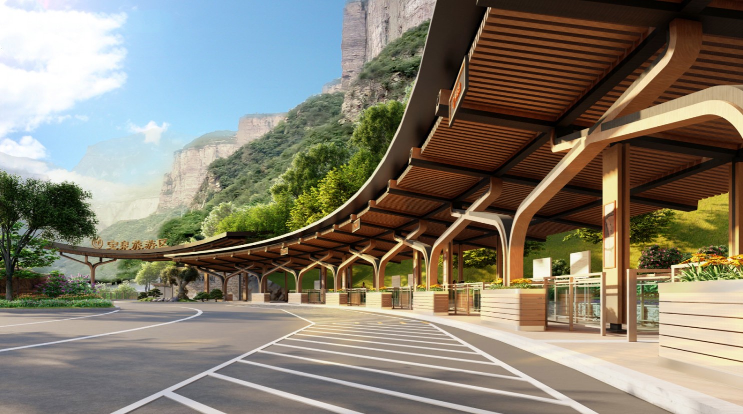 工程内容:景区钢结构大门、候车区钢结构长廊、返程候车地下连通廊道及地面铺装。
